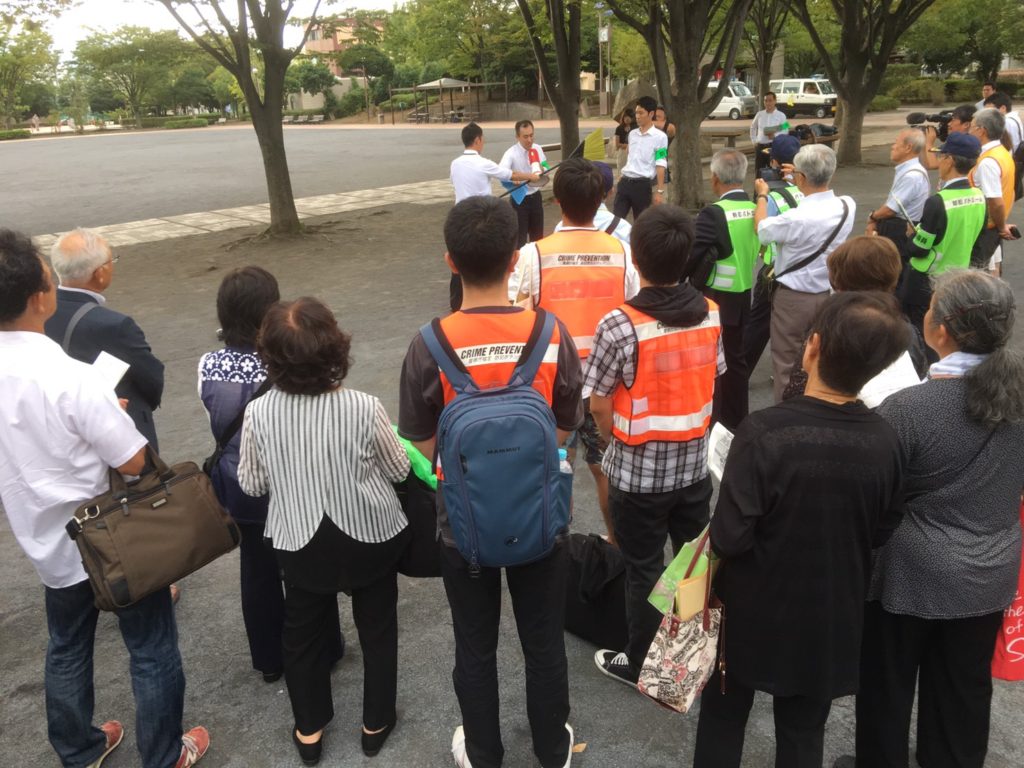 神奈川県警察が主催した子ども見守り活動にかかる研修会【実践編】に参加して参りました。第二部では実際に屋外へ出て警察官の指導の下実践的な研修が行われました。
